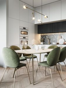 Jika ruangan sebelumnya menggunakan sage green pada dinding rumah maka di ruang makan ini dapat di aplikasikan pada furniture seperti kursi. Penggunaan warna ini membuat suasana ruang makan akan terlihat lebih elegan sehingga akan semakin nyaman kita dalam menyantap makanan karena ruang yang nyaman.
